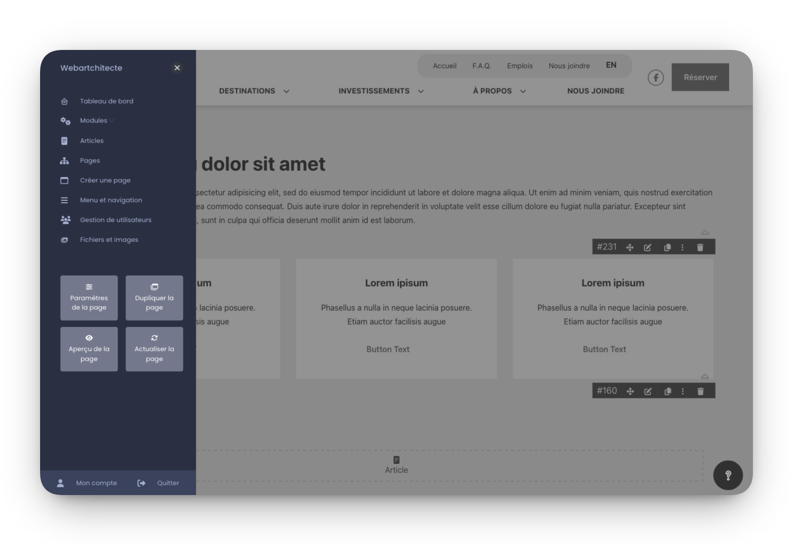 Modifiez vos contenus directement là où ils apparaissent sur le site. Pas besoin de prévisualisation — les changements sont visibles immédiatement. Si vous savez utiliser Word, vous saurez utiliser Webartchitecte.