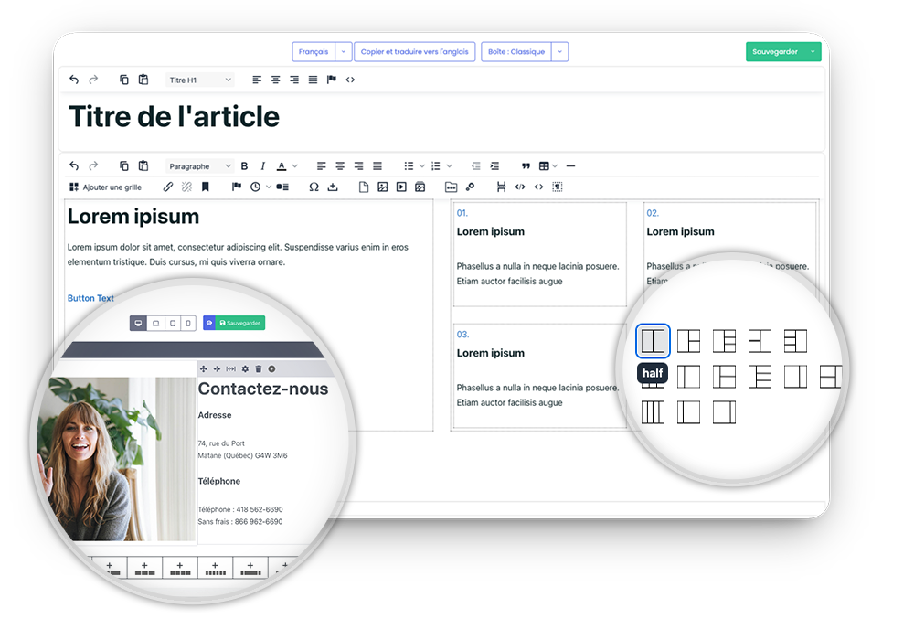 Gérez la mise en page de vos contenus sur chaque taille d'écran grâce à l'outil grille intégré. Ordinateur, tablette, portable, téléphone — vous contrôlez l'apparence de vos pages sur chaque breakpoint, avec prévisualisation en temps réel.