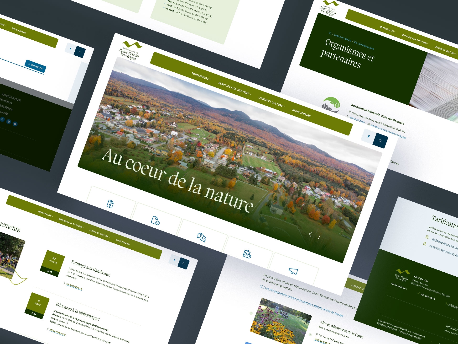 On a conçu un univers visuel élégant et ancré dans l'identité « Au cœur de la nature » de la municipalité. Photographies grand format, palette inspirée de la nouvelle image corporative et mise en page aérée : le site donne le ton dès la page d'accueil et inspire un sentiment d'appartenance.